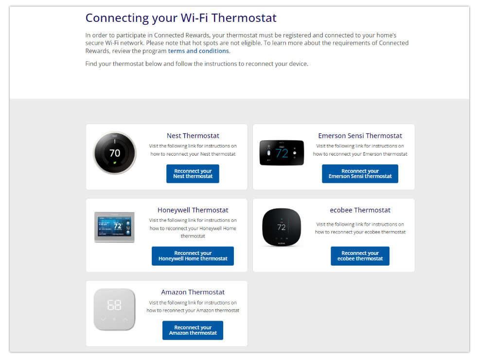 Frequently Asked Questions Overview What changes are coming to Connected Rewards℠ in 2026? Incentives for program participation will be moving from prepaid gift cards delivered at the end of the season to $10 a month, per smart thermostat, in bill credits.Connected Rewards adjustment events will now occur year-round for eligible customers using electric heat (January-December).Adjustment events will be more frequent but have smaller temperature adjustments throughout the year. These are designed to be imperceivable to the customer, which means less disruption and more comfort for you. Why did BGE create Connected Rewards℠? When demand for electricity usage is high, providing reliable power to our customers becomes more important than ever. Reducing peak electricity demand can help reduce the need for additional power plants, keep electricity costs low and ensure our communities remain powered. The Connected Rewards program makes small, temporary changes to your smart thermostat temperature settings to reduce peak electricity demand, which usually occurs on hotter or colder days when homes and businesses are using high amounts of electricity for heating and cooling. Adjustments are designed to have minimal impact on your daily life, and BGE will closely monitor the impact on customers. Who should sign up for the Connected Rewards Program? Connected Rewards is a great choice for customers who want to earn bill credits with little to no effort and total control. While participants can opt out of any adjustment event simply by changing the temperature on their thermostat, this program is not recommended for customers who have medical or health conditions, are elderly, or who may have small children or pets at home. Which thermostats qualify for the program? To see a list of qualifying thermostats, visit the Eligibility page. Where can I find the terms and conditions for this program? You can find the terms and conditions for all thermostat providers in the list of qualifying thermostats. How do I connect/reconnect to Wi-Fi? Your connection/reconnection instructions vary depending on the type of thermostat you have. Please click here to find your thermostat’s directions.Staying online is also essential to ensure your ongoing participation in the Connected Rewards Program. If your thermostat is offline for six weeks, you will be automatically removed from the Connected Rewards Program and miss out on annual bill credits. Enrollment How do I know if I can enroll? To be eligible for Connected Rewards, participants must:Be an active BGE residential electric customerUse an eligible internet-connected (Wi-Fi) thermostat for coolingHave an AMI/Smart meter installed at the location of the active account associated with the devices being enrolledAgree to terms and conditions as outlined by each thermostat manufacturerCooling system must not be currently enrolled in PeakRewardsAllow BGE to make small thermostat adjustments of up to 4 degrees on high-energy usage days Why would I be ineligible for Connected Rewards at this time? Customers would be ineligible for the Connected Rewards Program if they:Do not have a qualifying Wi-Fi thermostatDo not receive electric delivery service from BGEDo not have an AMI/Smart meter installed at the location the device is installedLive in a multifamily property that is owned by a property managerLive in a landlord-owned property with an automatic change agreement on the account*PeakRewards Participants who enroll in Connected Rewards will be unenrolled from PeakRewards. How do I sign up for the Connected Rewards Program? To enroll in the Connected Rewards Program visit the enrollment portal and select your thermostat. Then click the “Sign Up!” button to go to your thermostat’s website, where you will follow simple steps to enroll. Once BGE confirms your eligibility, you will be enrolled in the program. You will receive a notification on your eligibility status in your account’s registered email. How can I confirm that I’m enrolled in BGE’s Connected Rewards program? You can confirm your participation in the smart thermostat manufacturer app. Steps are dependent on your thermostat brand:Thermostat BrandManufacturer AppStepsHoneywell HomeResideo app orFirst Alert app1. Open the Resideo or First Alert app on your mobile device. 2. Go to the Main Menu and tap on “Find Rebates”. 3. Select your energy provider’s program. 4. Choose your thermostat device and verify your name, address, and ZIP code. 5. If you're already enrolled, it should show your participation status or any active offers. 6. If not enrolled, you’ll have the option to sign up.NestGoogle Home app1. Open the Google Home app on your mobile device. 2. Tap Settings. 3. Under Nest services and support, tap Subscriptions. 4. Tap Rebates and rewards. 5. You’ll see any energy-saving programs you're enrolled in, including Rush Hour Rewards if applicable.SensiSensi app1. Open the Sensi app on your mobile device. 2. Go to Settings or Account. 3. Look for a section labeled “Rebates and Rewards”, “Energy Programs”, or “Demand Response”. 4. If you're enrolled, it should show your utility provider, program name, and status.AmazonAlexa app1. Open the Alexa app on your mobile device. 2. Go to your Amazon Smart Thermostat settings. 3. Tap on “Energy Incentives”. 4. If you're enrolled, it will show your utility provider, program name, and status.EcobeeEcobee app1. Open the Ecobee app on your mobile device. 2. Tap the Account icon (top left). 3. Select eco+ from the menu. 4. Make sure eco+ is activated - this feature is required for demand response participation. 5. Go to My Home > Manage Homes. 6. Edit Utility Information and select your utility provider. 7. If your utility offers a program, you’ll see an option to enroll. Tap OK to confirm.If you cannot confirm your enrollment status through the manufacturer app, you can reach out to BGEConnectedRewards@icf.com to confirm enrollme